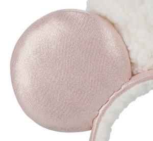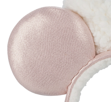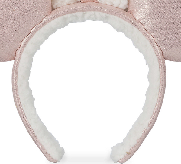 The ears are made of a pink lamé material and they’re padded. There’s a little shine to the ears, because of the lamé material, which also adds to the winter look of these ears. Both the front and the back are covered with the same pink lamé material, so they look the same on both sides.