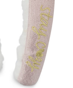 For the headband both materials are used. The pink lamé material covers the outside of the headband. In addition, the outside of the headband has the words “Stay Cozy” embroidered on one side and the “o” in “Cozy” is a Mickey head. That fluffy sherpa material can be found on the inside of the headband.