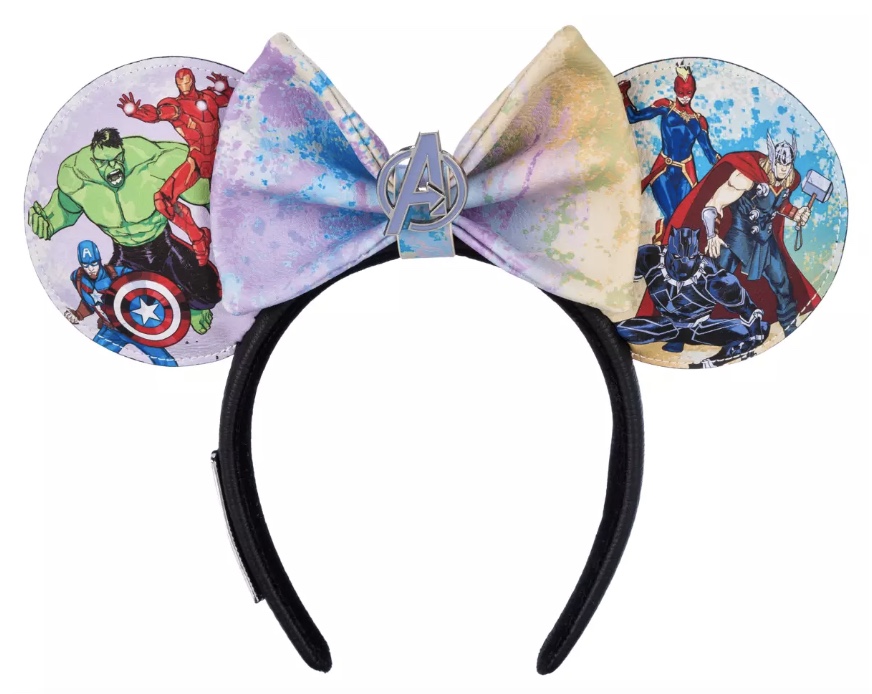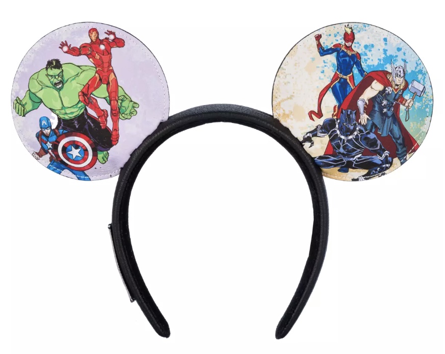 The ears each have three Avengers pictured on them. One ear has Iron Man, Hulk, and Captain America. The second ear has Captain Marvel, Thor, and Black Panther. Each ear has what looks like paint splatter with different colors. The back of the ears are a plain black color.