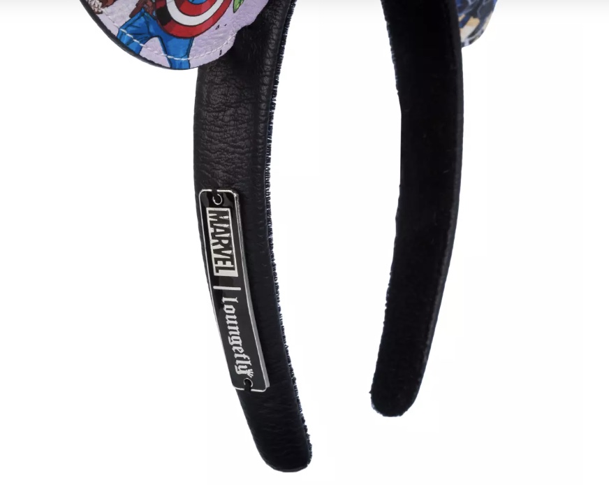 On the headband, a simulated black leather material covers the outside and a black non-slip velour material covers the inside. In addition, there is a Marvel/Loungefly logo plate on one side of the headband.