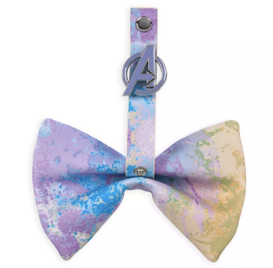 The bow has the same splattered paint coloring on it with an Avengers logo brooch in the middle. The different feature with this bow is that it is removable. So the bow can be taken off and placed on something else, or left on the headband.