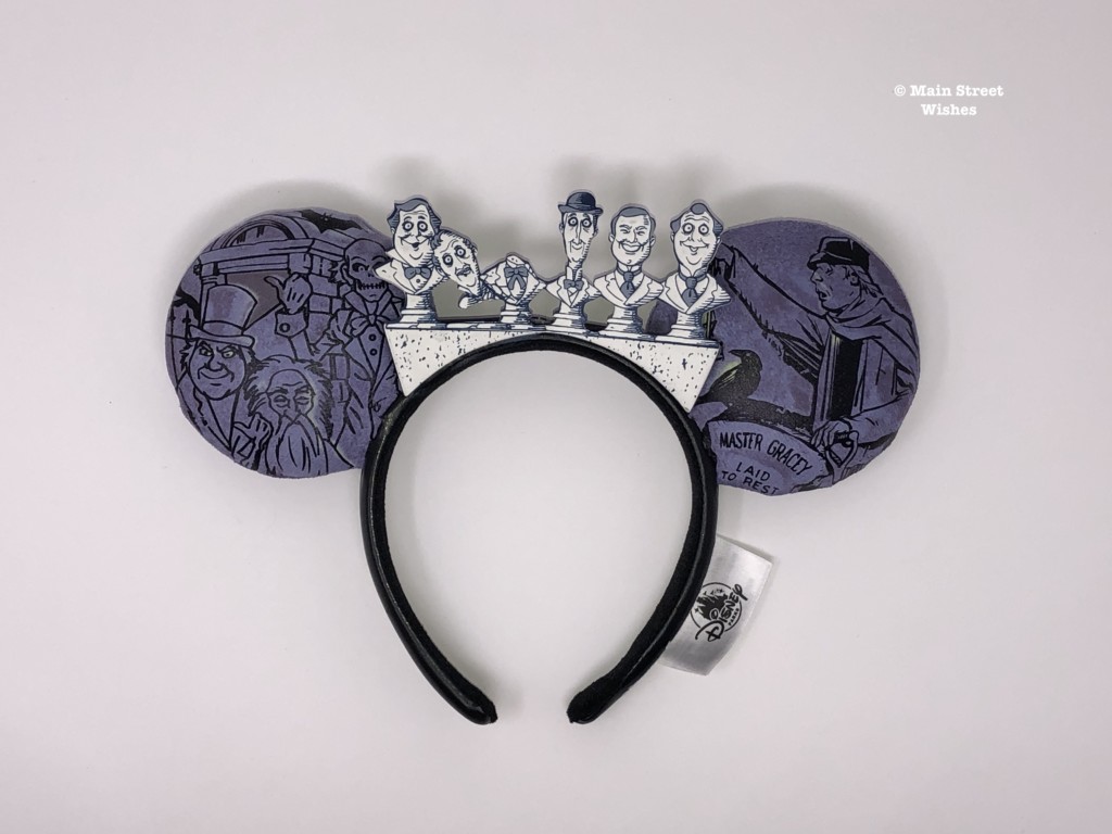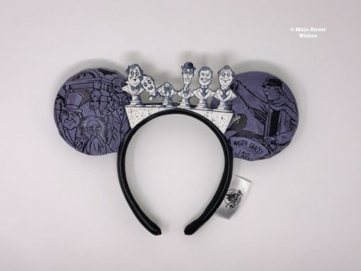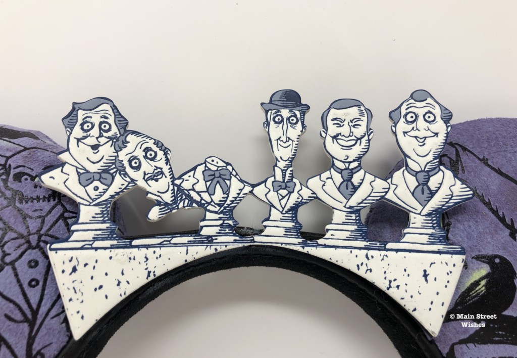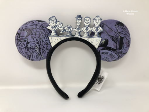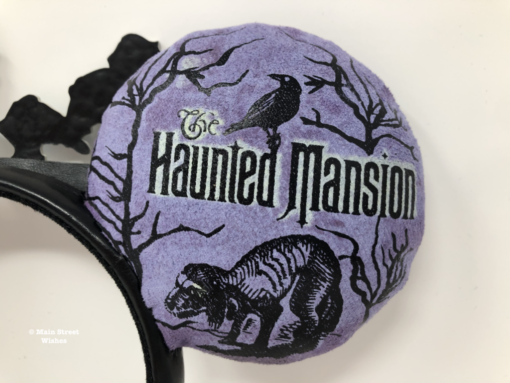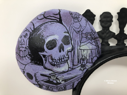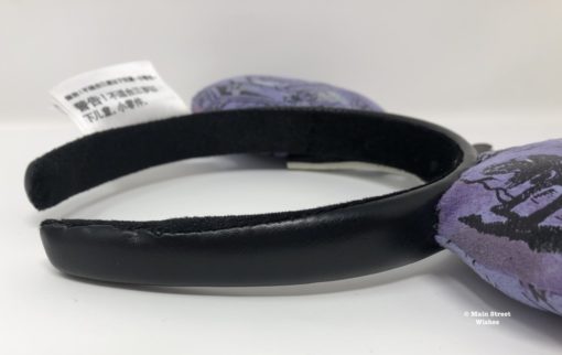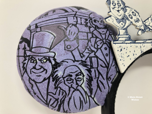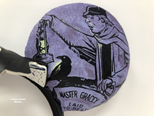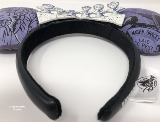The ears on this headband have the most detail. There are scenes from the graveyard scene at the end of the Haunted Mansion ride. You’ll see the three hitch hiking ghosts and the nervous gravedigger with his lantern are on the front of the ears. On the back you will see some skull art along with the ghost trying to get out of the coffin on one ear and the Haunted Mansion logo on the other ear. The ears are purple and made of an imitation suede material.