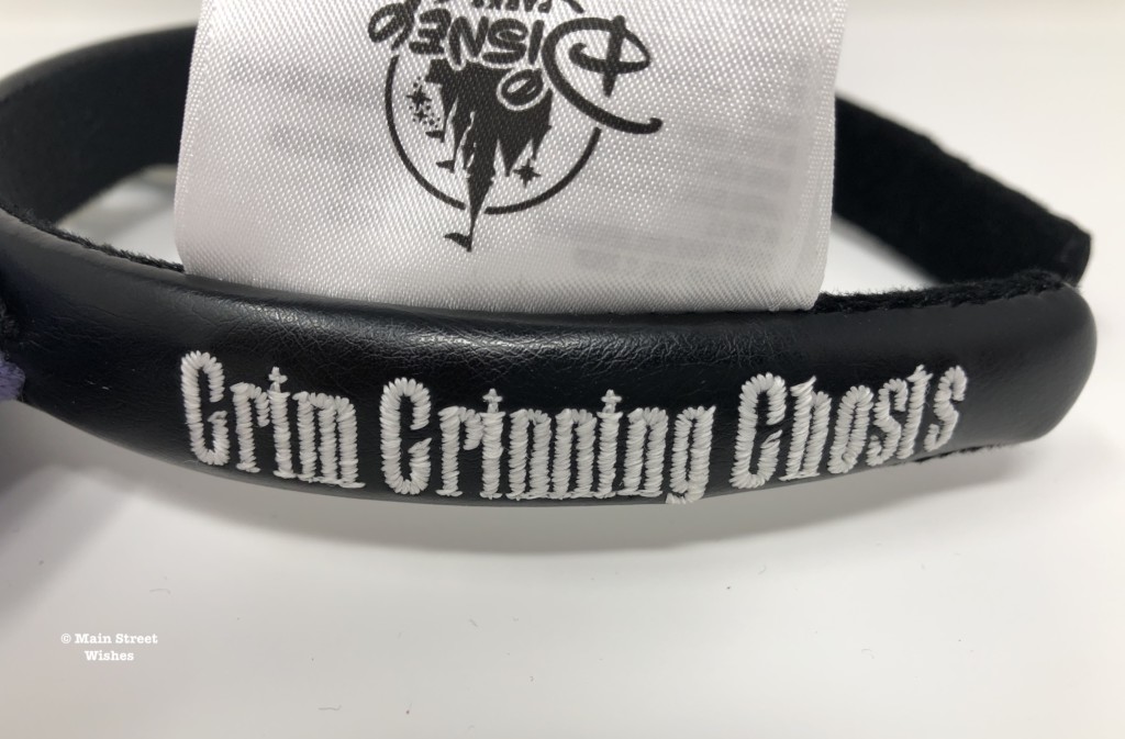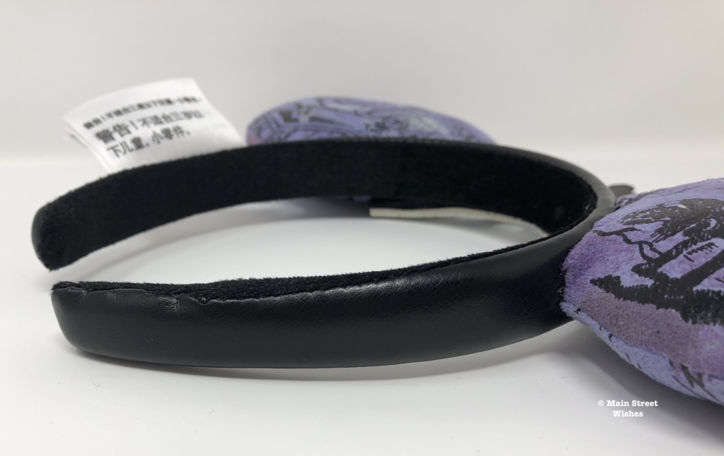 The headband is covered with imitation leather and it has Grim Grinning Ghosts embroidered on one side. This feature also glows in the dark. The inside of the headband is covered with a soft velvet-like material.