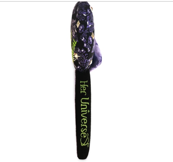 On the headband there are two different fabrics. A black velour material covers the outside of the headband and a purple non-slip velour material covers the inside. Each side of the headband has something written on it. One side has “The Haunted Mansion” embroidered on it and the other side has “Her Universe” embroidered on it.