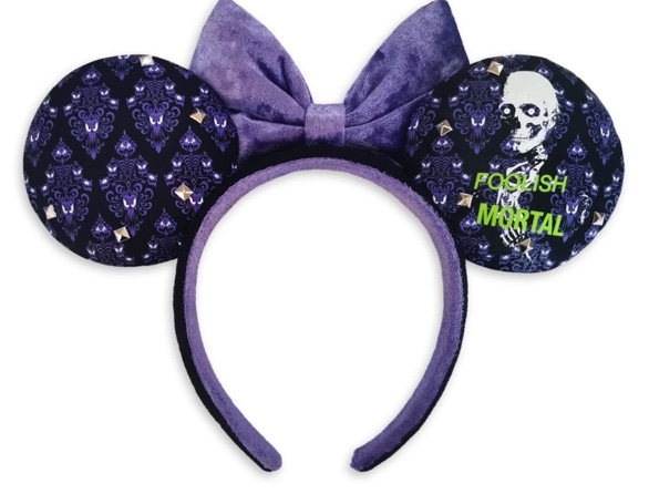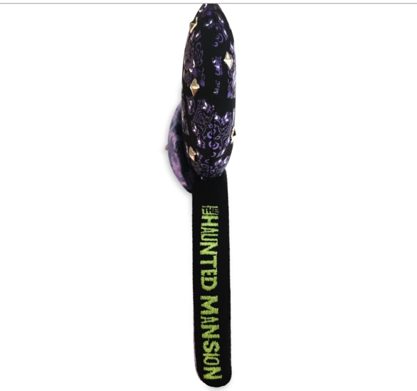 A purple and black fabric covers the ears and it has the same design as the wallpaper on the Haunted Mansion ride. On the border of the ears are square, metal studs. These studs can be found on both sides of the ears. On the other side of the ears there is also screen art on the left ear that features a skeleton with the words “Foolish Mortal.”