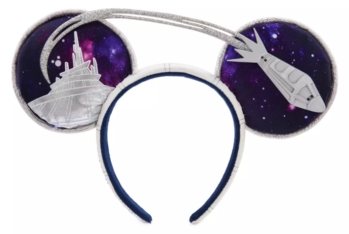 The ears each have a different picture representing the ride. On the right ear is a silver design of the Space Mountain building. Leading from the right ear to the left ear is a silver vapor trail, which takes the place of a bow on these ears. The left ear features a 3D space rocket, like the ride vehicles. Both ears have a purple, star-field backdrop. If you look closely at those star-fields you’ll be able to see a hidden Mickey.