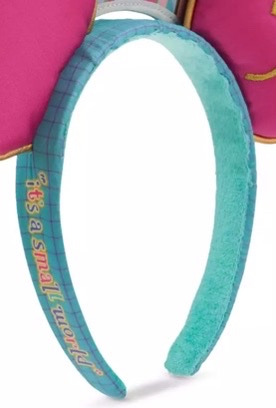 The headband is turquoise, with the inside being a non-slip velour material. The words “it’s a small world,” are printed on one side of the headband.