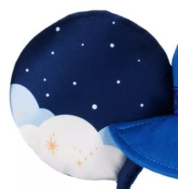 The ears on this pair are decorated on the front with clouds and stars. Clouds with a trail of pixie dust cover the bottom of the ears and the top of the ears have a navy background with little stars. One of the ears has the “second star to the right” embroidered on it. On the back of the right ear the 50th anniversary logo is embroidered.