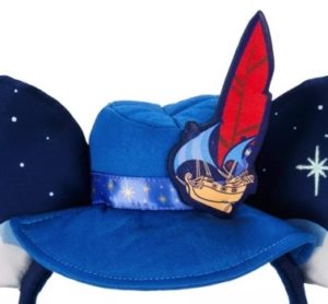 Instead of a bow, there is a twill hat in between the ears. The hat is blue with a blue satin ribbon around the middle. Also on the ribbon is a pixie dust design. A felt pirate ship and felt red feather decorate the hat as well.