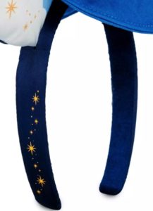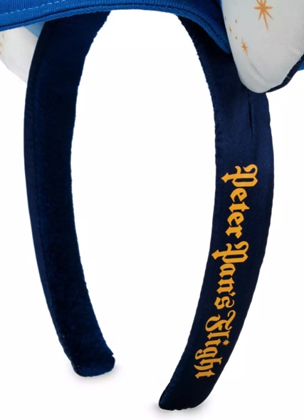 The headband is covered with the same navy colored material. One side of the headband has the Peter Pan’s Flight logo printed on it and the other side has a trail of pixie dust halfway up the headband.