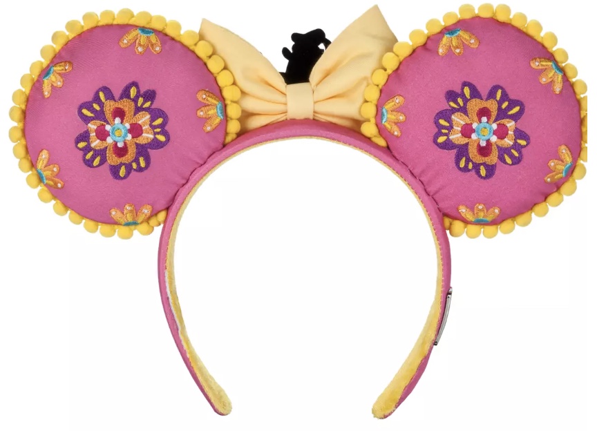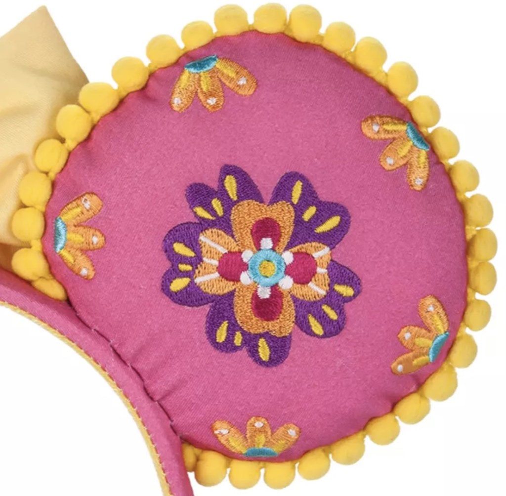 One look at these ears and it’s clear what the theme is. Each ear has a caballero on the front of it. One has Panchito and the other has José. In addition, there are floral designs on the front over the pink fabric. Each ear is trimmed with yellow pom pom fringe, which is a cute feature on this pair. The back of the ears have more floral designs on them, but no caballeros.