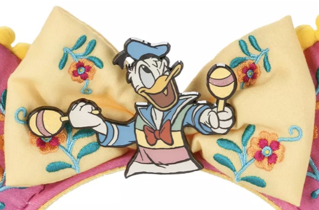 In the center of the headband is the bow and the theme is continued on the bow. A yellow fabric bow sits in between the ears and it also has a floral design on it. In the center of the bow you will find the third caballero, Donald Duck, playing the maracas.