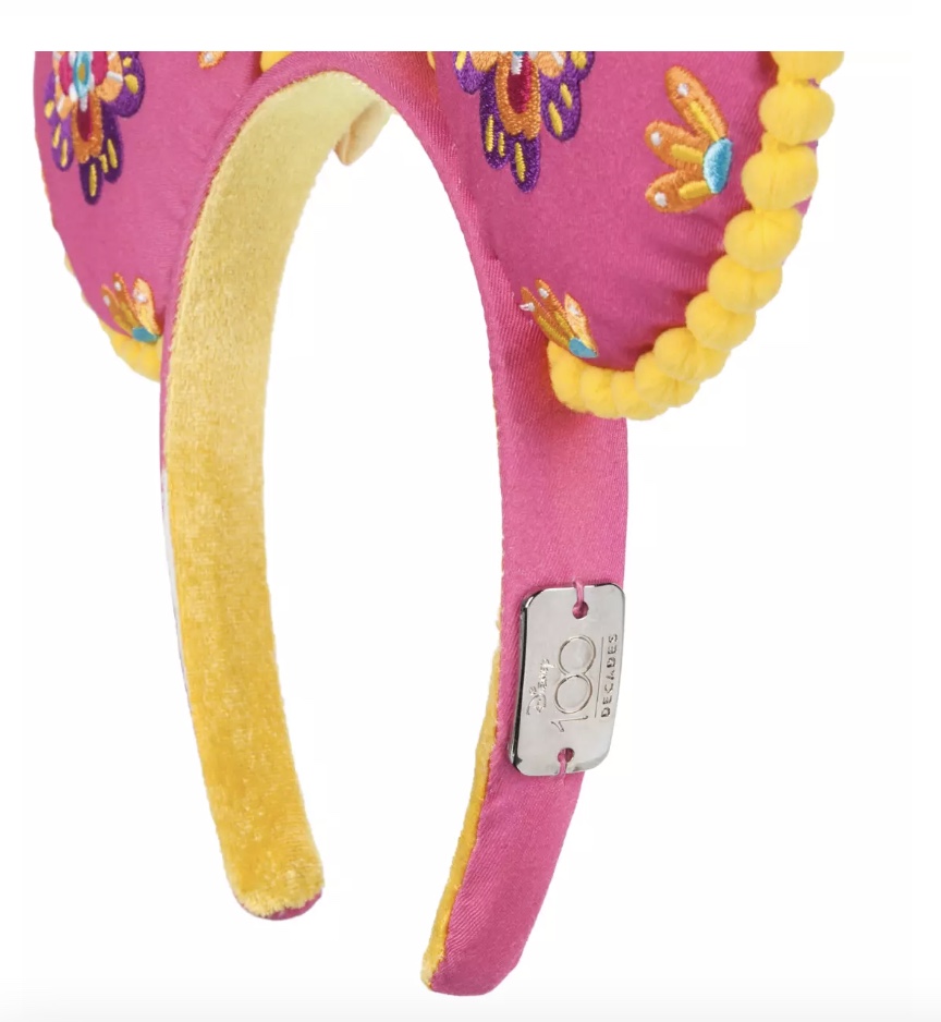 Moving on to the headband, the outside is covered in the same pink fabric as the ears. Also on the outside is a Disney100 logo plate, showing that it is part of the collection. The inside of the ears are covered with a yellow fabric, which matches back to the yellow pom pom fringe.