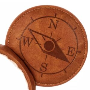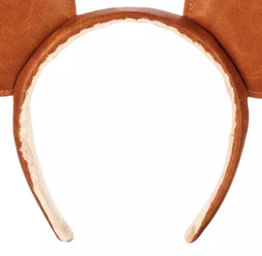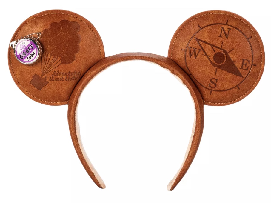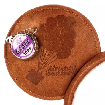 The ears are made from a brown simulated leather and have a little bit of a worn look to them. On the right ear is an embossed design of Carl Fredricksen’s house with balloons and a grape soda bottle cap brooch, just like Ellie’s. Another embossed design on the left ear is a compass. The back of the ears do not have any embossed designs.