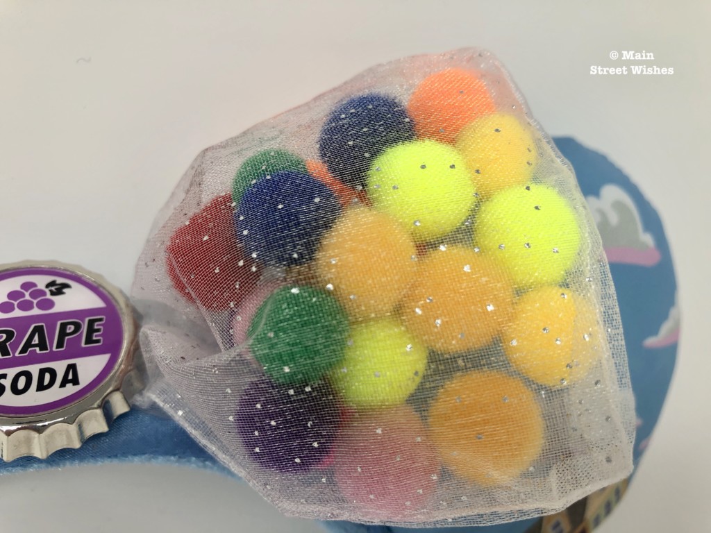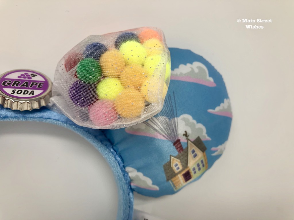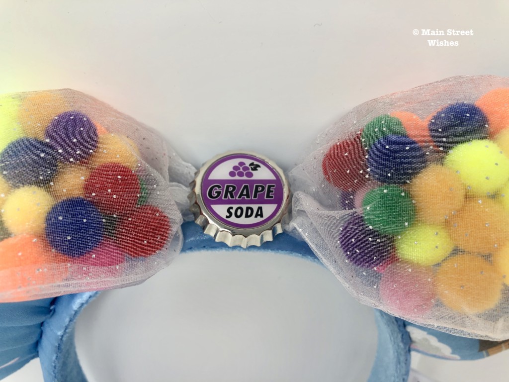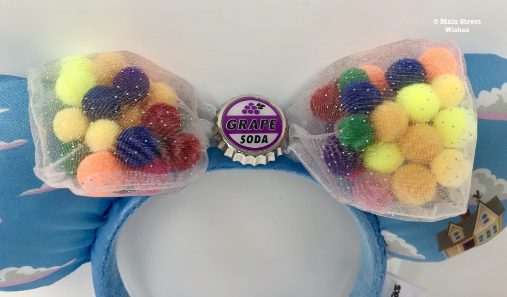 As I said above, the bow has different colored pompoms inside. So the pompoms on one side of the bow are supposed to look like the balloons that Carl Fredricksen attaches to his house to make it fly away. The material of the bow is see through, so you can see the pompoms, but there is glitter in the material, so it has a little sparkle to it. And what would Up ears be without the beloved Grape Soda pin that Ellie gives to Carl when they were kids? The Grape Soda pin sits right in the middle of the bow, front and center of the headband.