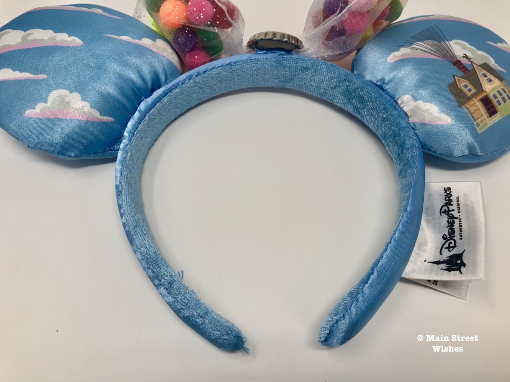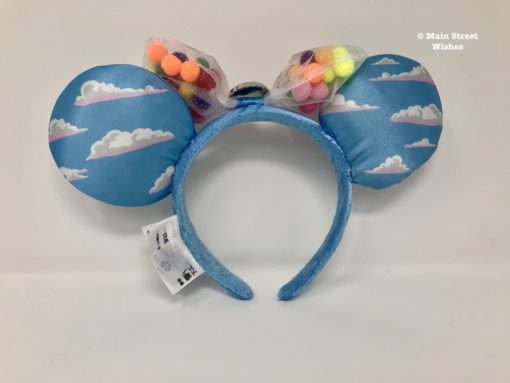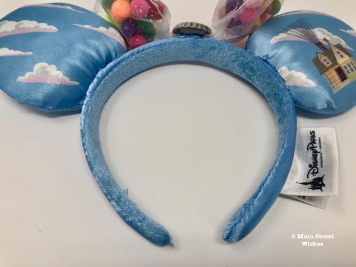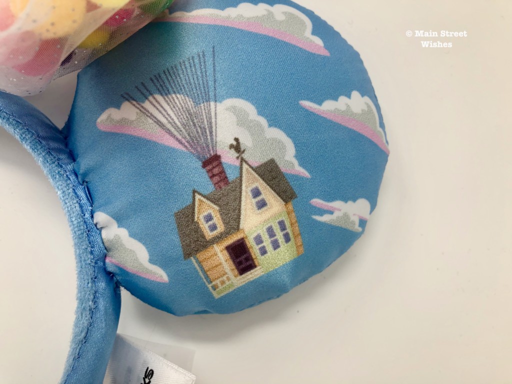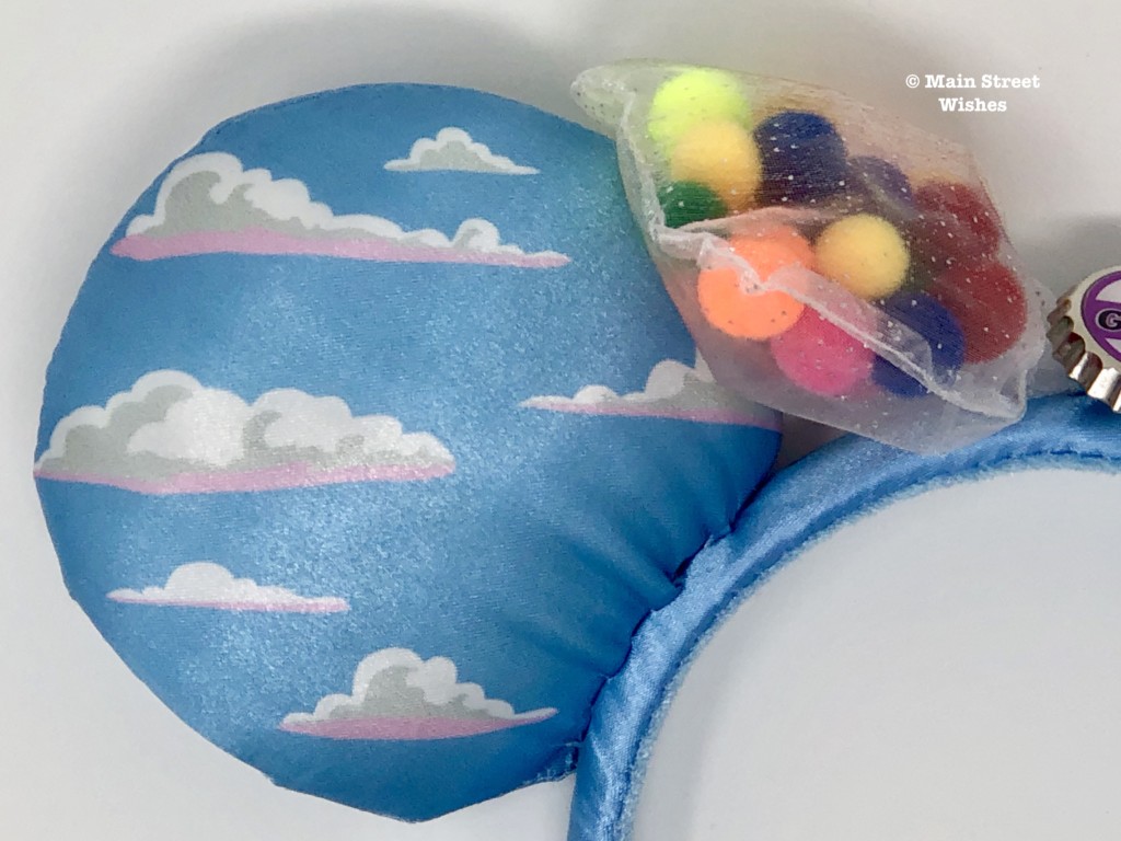 The ears themselves are smooth material and there are no sequins on these ears! The material is supposed to look like the sky, so the background is a light blue color and there are clouds on both ears. One of the ears also has the Up house pictured on it with strings for the balloons coming out of the chimney. The really cute part is that the balloons are not pictured on the ear, but instead the strings lead up to the bow, so the pompoms in the bow look like the balloons. Such a cute design idea!