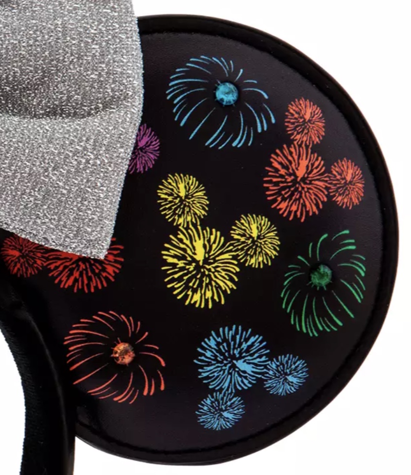 The ears on this headband have regular fireworks and Mickey shaped fireworks on the front and a plain black material on the back. On the front, each ear has a few fireworks that light up with colored rhinestones.