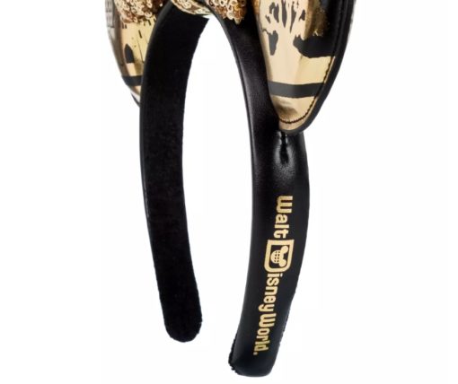 The same simulated leather material on the ears also covers the outside of the headband. On the inside is a non-slip black velour material. The Walt Disney World logo is printed on the outside of the headband in gold writing.