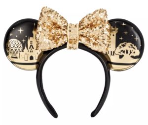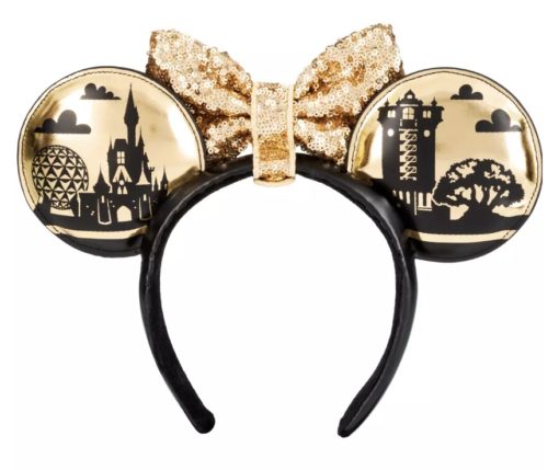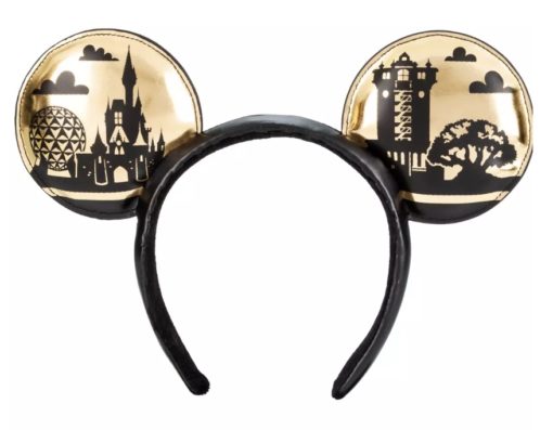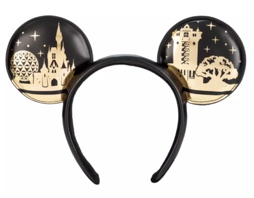 All four icons of the theme parks are represented on the ears. The colors for this pair are black and gold and that is shown on both the front and back. On the front of the ears the icons are gold and the background is black, but on the back of the ears the colors are switched. So the icons are in black and the background is gold on the back of the ears. The black background represents night, so there are gold stars, and the gold background represents daytime, so there are clouds that are black to match the icon colors. The fabric of the ears is a simulated leather material.