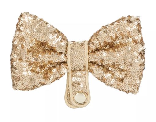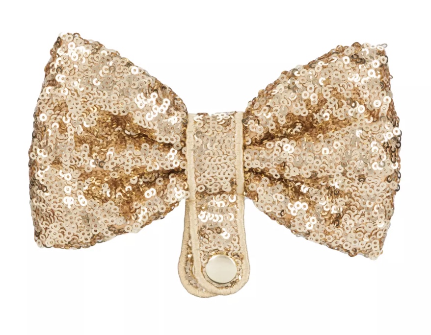 Moving on to the bow on this headband, which is a fun feature. The bow is detachable, so it can be placed in between the ears or detached and left off all-together. The bow is made of a gold sequin material and has a snap fastening to attach it to the headband.