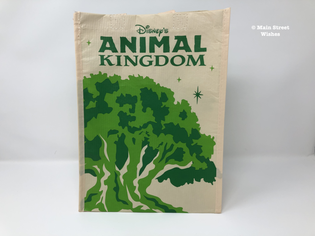The Animal Kingdom bag is beige with the Tree of Life and the park’s name on the front. On the back of the bag are pictures representing different areas around the park: Expedition Everest, a rhinoceros, and the flying mountains, banshees, and Na’vi from Pandora. Mickey is smiling on this bag as well and his look makes it seem like he is watching the Na’vi and banshees.