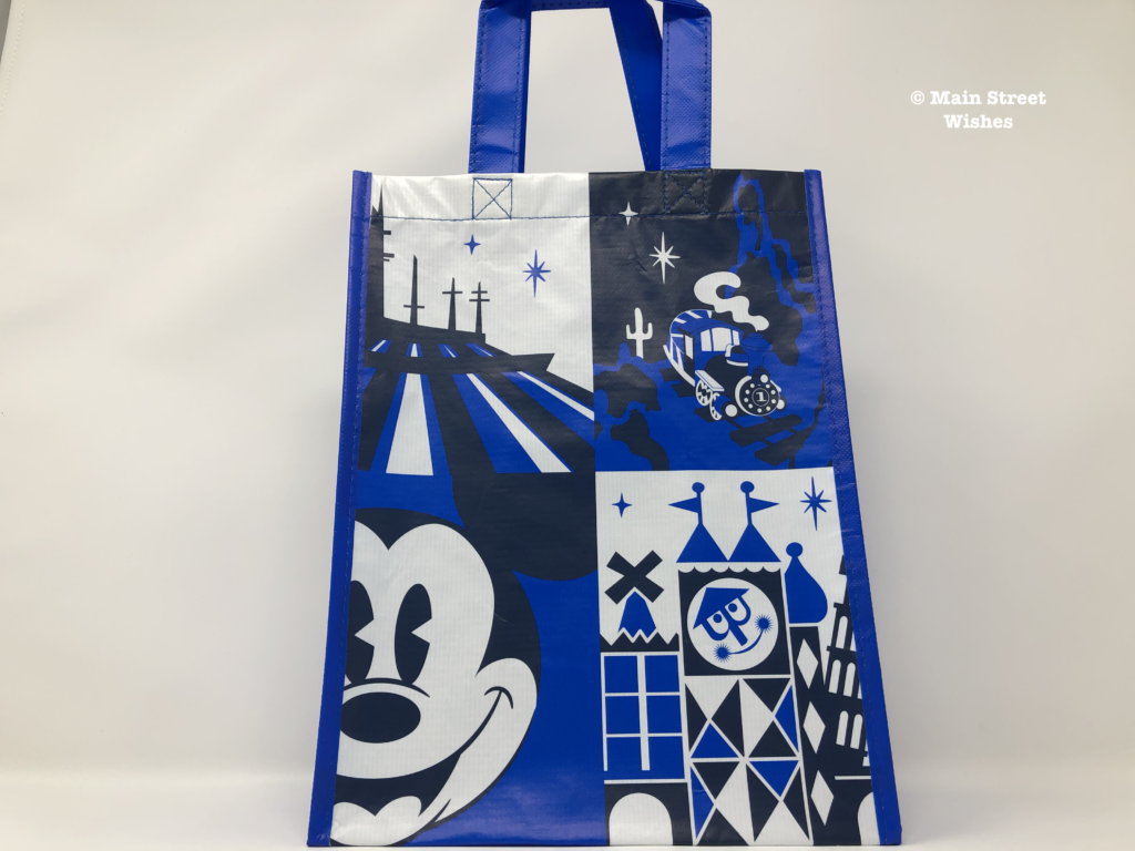 The Magic Kingdom bag is blue and has the park’s name on the front along with Cinderella Castle. On the back of the bag are different well-known attractions: Space Mountain, Big Thunder Mountain Railroad, and “it’s a small world.” There is also a picture of Mickey smiling on the back of the bag. Mickey appears on all four bags, but he’s making different expressions on each bag.