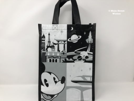 The Epcot bag is black and along with the park’s name on the front of the bag is Spaceship Earth. On the back of the bag are different buildings from around the World Showcase, an image representing Mission Space, and the Monorail. On this bag Mickey is smiling and his side profile is shown.