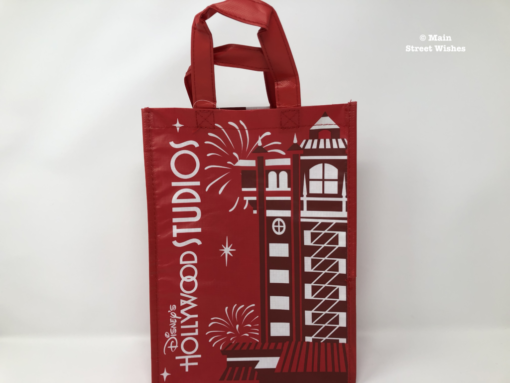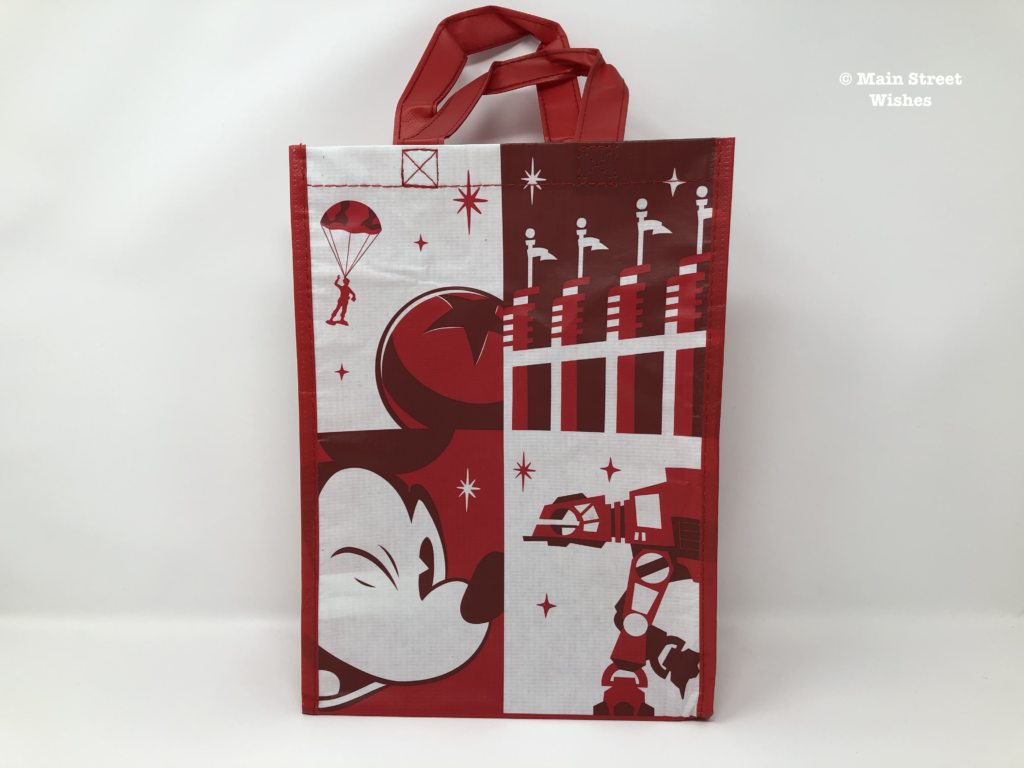 The Hollywood Studios bag is red and it has the park’s name as well as an image representing the Hollywood Tower of Terror on the front of the bag. On the back of the bag are pictures representing Toy Story Land (the Luxo Ball and a Green Army Man parachuting into the picture), the entrance to the park, and Star Wars (an AT-AT is pictured). Mickey is shown winking on this bag.