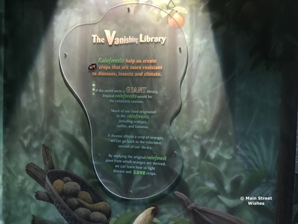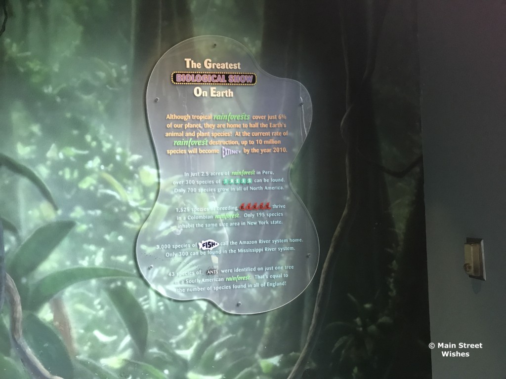 One of my favorite areas is “Songs of the Rainforest,” which is a hallway of different rooms where guests can where headphones to hear different animals and insects from the Rainforest. It’s a great place to take a break! I hope it returns when the area reopens, but we will see.