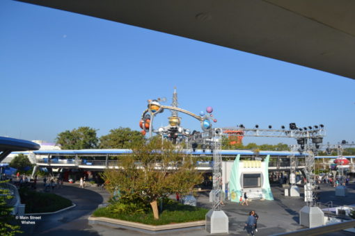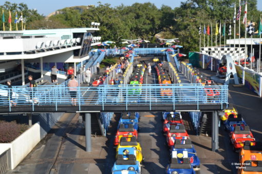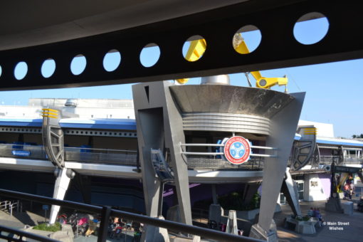 There is a moving sidewalk that will take you up to where the ride is. Once you reach the top you will get into a ride vehicle and you are on your way! The ride moves (slowly) through Tomorrowland and runs about 10 minutes, give or take. So guests pass each other on opposite tracks throughout the ride. There’s usually a lot of waving that goes on, by both kids and adults.