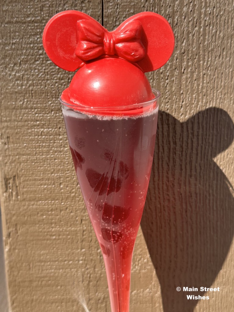 Amorette’s Patisserie is located in the Town Center area of Disney Springs, next to the World of Disney Store. One of the items this store is known for is the character dome cake. These cakes are, as the name suggests, dome shaped. The cakes are decorated with the colors of different Disney characters, like Mickey and Donald. In addition to the dome cakes there are other pastries (some themed after other Disney characters), crepes, sandwiches, and drinks (both alcoholic and nonalcoholic). One of the drinks on the menu, Sparkling Red, comes with a white chocolate Minnie Mouse topper.