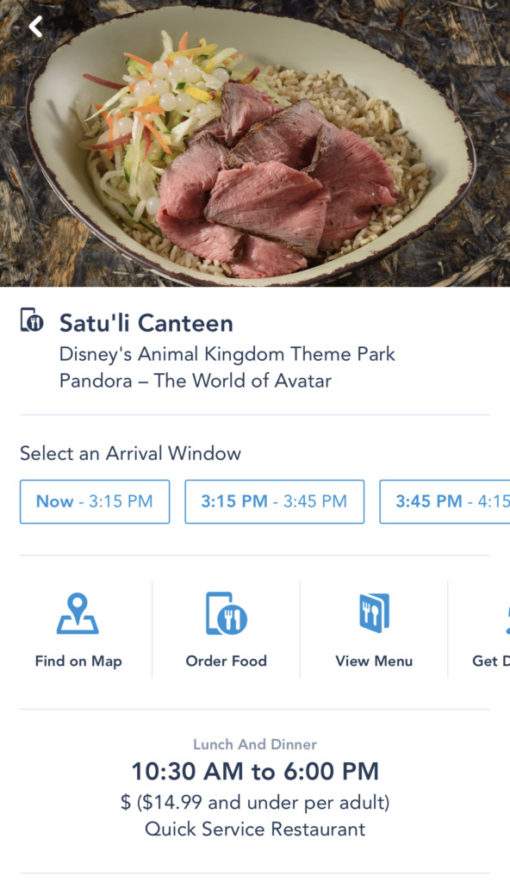 The cost of the slow-roasted sliced grilled beef bowl is $13.99. They give you a good amount of food, so the price is better for what you get than some other places on Disney World property. I never leave hungry, that’s for sure. Satu’li Canteen also offers mobile ordering as well. In fact, they were the first quick service to offer mobile order, so they probably have it down pretty well by now. Look under the Mobile Order section on the My Disney Experience app and you can order right from the app.