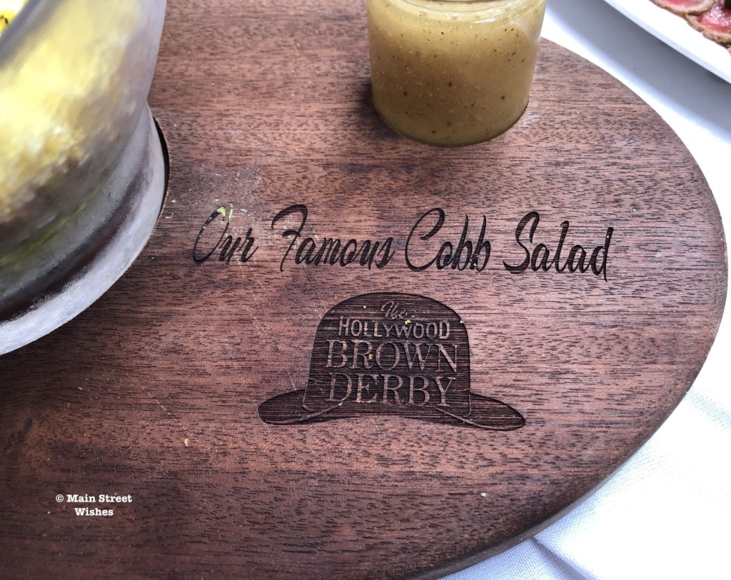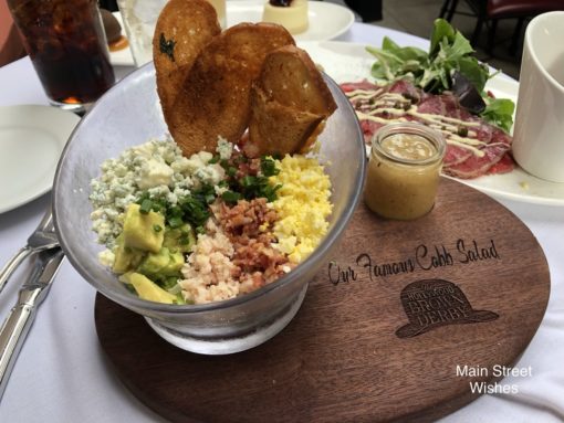 Supposedly, the Cobb Salad was created in 1937 by the owner of the Hollywood Brown Derby, Robert Howard Cobb. The story goes that he had not eaten and it was very late in the day, so he took a bunch of ingredients from the kitchen (including bacon cooked by the line cook), and mixed it with some French dressing. This was the start of the famous Cobb Salad, which is available to order at the Disney World location.
