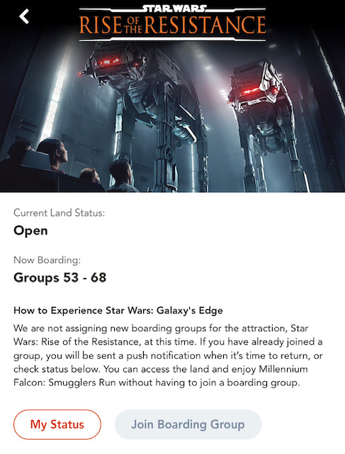 Here is how it shows in the My Disney Experience app for Rise of the Resistance. The boarding group numbers change as the day goes on, but the statement about not assigning new boarding groups remains the same.