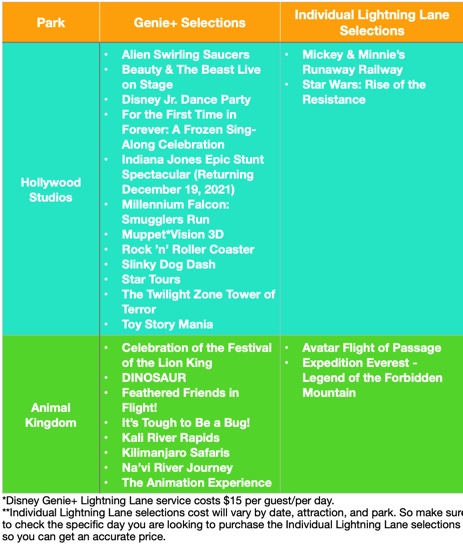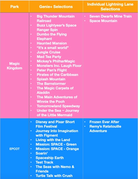 This is the new service that comes with a cost. Genie+ is the option that includes the most rides and costs $15 per guest, per day. With this option guests can pick one attraction at a time to reserve the next available arrival time for Lightning Lane. For guests who have the Park Hopper option they will be able to pick rides at different parks throughout the day. Guests can choose to purchase this service or wait until the day of their park visit to add it. Regardless of when the service is purchased, guests with Genie+ can book their first selection at 7 a.m. on the day of their visit. All other guests will be able to make their selections at park opening. With Genie+ there are over 40 attractions included, but not all are on this list. Some attractions are an additional cost.
