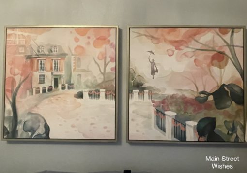 The Mary Poppins theme is also shown on the lampshades, pictures, and behind the coffee maker, where the mini fridge is. The wallpaper behind it shows a scene with Mary.