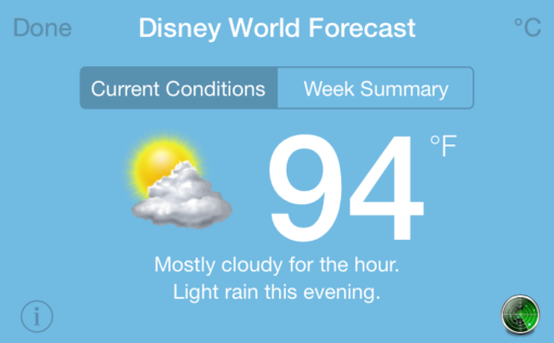 We have added some new features to the Countdown for Disney app and we hope you will find them useful. Now you can check the radar over Disney World and we have added Weather History so you can see what last year’s weather was like for the week you are going to be in Disney World.