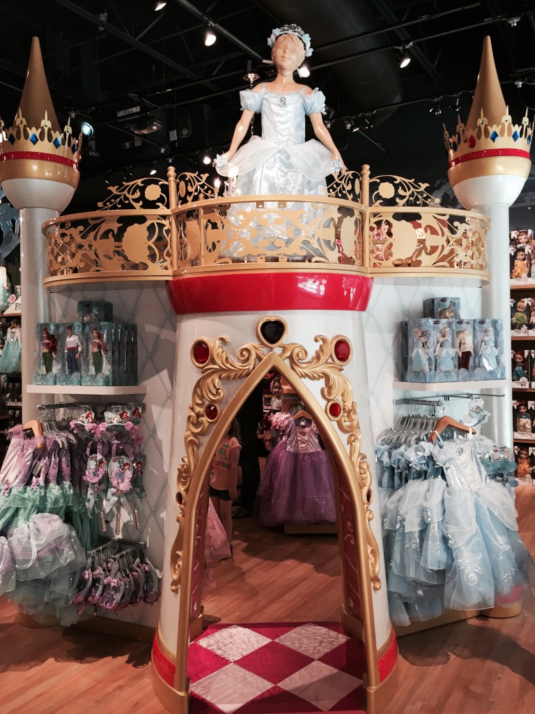 When you enter the store look down and you will notice that the walk-way that winds itself around the store has sparkles in it (it’s hard to see the sparkles in the picture, but they’re there). This almost reminds me of the sparkles in the walk-way at night in Future World in Epcot. It’s fun and adds to the magic. Now look to your right and you will see the fun little castle that kids can walk through. My daughter loved this! It’s very cute and it is, of course, surrounded by princess dresses and accessories.