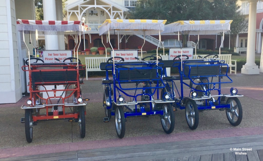 When visiting the BoardWalk area you will see guests riding these around the lake. You can rent a single or a double bench surrey bike. Disney’s BoardWalk connects with the Yacht and Beach Club and circles back around. They have bells on them that you can ring to signal people that you are coming down the path.