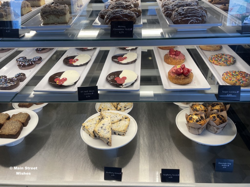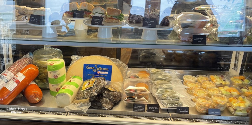 - Boardwalk Deli – This is where people staying at Disney’s BoardWalk Inn and Villas get their refillable mugs and where a lot of guests of the hotel get breakfast. This is mostly a sandwich shop for breakfast, lunch, and dinner, but they do also have some salads available for purchase. Baked goods like Mickey cinnamon buns and other pastries are also available.
