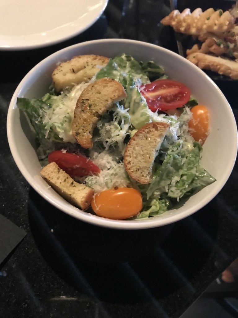 For food, we split the chopped Caesar salad. The dressing was great and the croutons seemed homemade and were big, crunchy and well seasoned. We also had a slider with truffles waffle fries. Both were amazing!!! The fries were covered in Parmesan cheese and did not even need ketchup! Our total price for all of this was $25.65 before tip.
