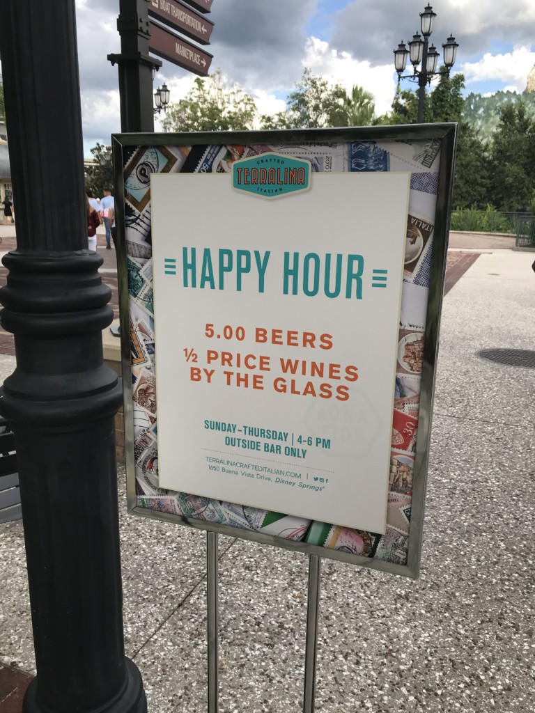 We took our beers in to go cups and walked over to a couple shops while we finished our drinks. We walked passed Terralina, a new restaurant in Disney Springs. It is where Portobello used to be and is right next door to Paddlefish. We saw their sign said happy hour until 6 so we knew we had about 25 minutes before we had to get back to order our drinks.