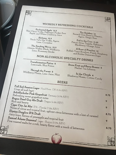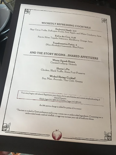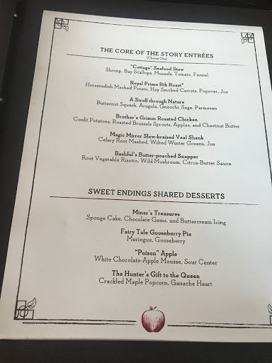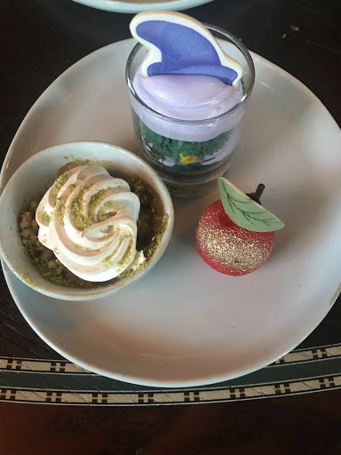 Dessert was shared just like the appetizers. Each person received one of each. The Dopey themed dessert, Miner’s Treasures, was sponge cake, chocolate gems, and buttercream icing. It tasted just like any other cupcake you could find in the parks. The Fairy Tale Gooseberry Pie was a meringue with gooseberry, which had almost a tart taste to it. My favorite was the “Poison” Apple. It was a white chocolate-apple mousse with a sour center. It tasted like a cheesecake to me and was beautiful and delicious.