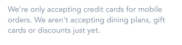 As of right now, Disney is not accepting dining plan credits, discounts, or Disney gift cards through the Mobile Order feature. So if you need to use any of those forms of payment you will need to order and pay with a cashier at the restaurant. Payments through the app can only be made with a credit card.
