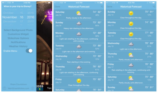We have added some new features to the Countdown for Disney app and we hope you will find them useful. Now you can check the radar over Disney World and we have added Weather History so you can see what last year’s weather was like for the week you are going to be in Disney World.