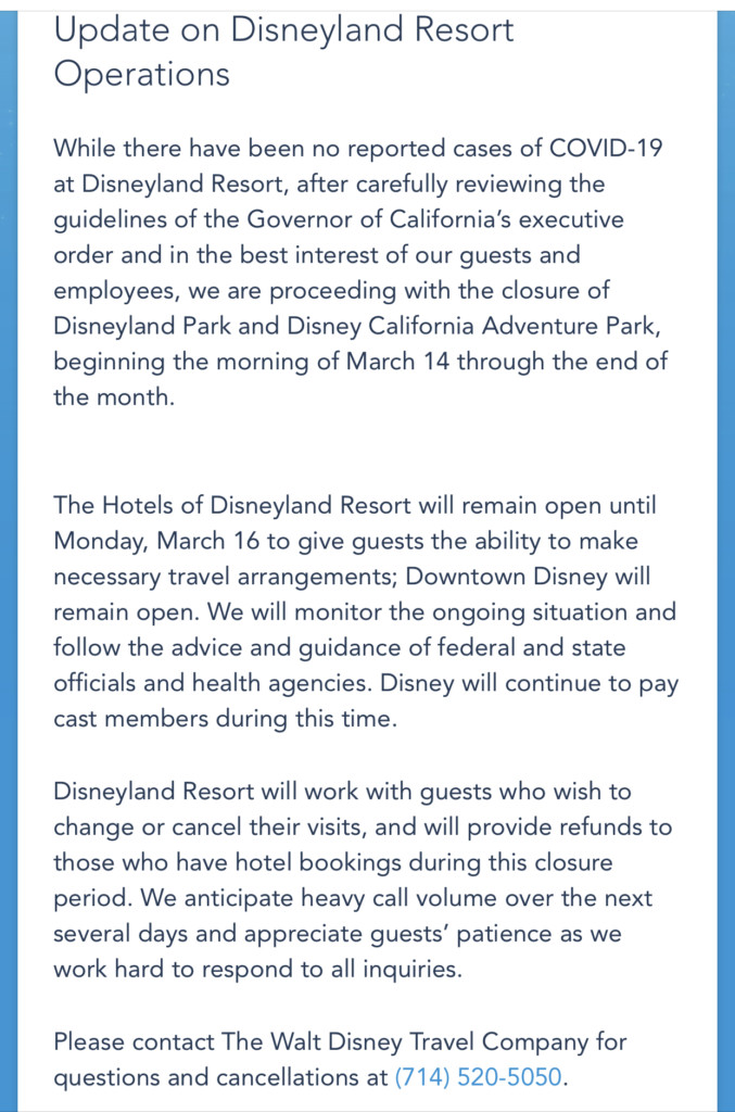 I’ll keep a lookout for any other information released on the closures and update you. If you have plans to travel to Disneyland or Disney World during the closure periods I would definitely call them. Keep in mind that the wait times on the phone will probably be long. However, if you booked your reservation through a travel agent they will call about your reservation, so you don’t have to. That’s one of the perks of booking through a travel agent.