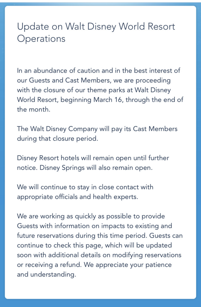 According to Disney both Disneyland and Disney World will be closed until the end of the month. Disneyland will close the parks on March 14 and their hotels will remain open until March 16, giving guests time to arrange travel home. Disney World will close its parks on March 16, but their hotels will remain open until further notice, as will Disney Springs. So if you are staying in Disney Word during the closure it sounds like you can still stay at the hotel, you just won’t be able to visit the theme parks, which kind of defeats the purpose for some people visiting. On the other hand, resort only stays can be fun and I’m sure Disney World will take very good care of all the guests staying at their hotels.