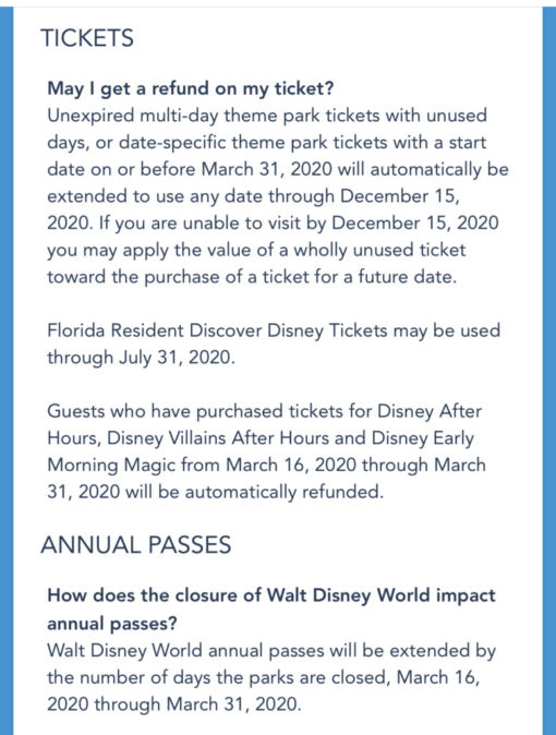 Disney has stated that guests with special event tickets with dates that fall into the closure period (March 16 – March 31, 2020) will receive automatic refunds. These events include Disney After Hours, Disney Villains After Hours, and Disney Early Morning Magic.