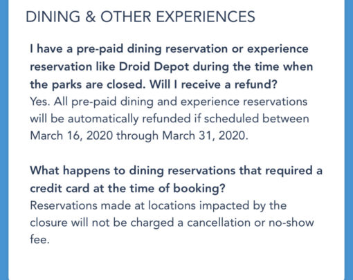 For pre-paid dining and experience reservations scheduled between March 16 – March31, 2020 Disney will automatically refund guests. In addition, reservations that are made at locations that are impacted by this closure will not be charged a cancellation or no-show fee.