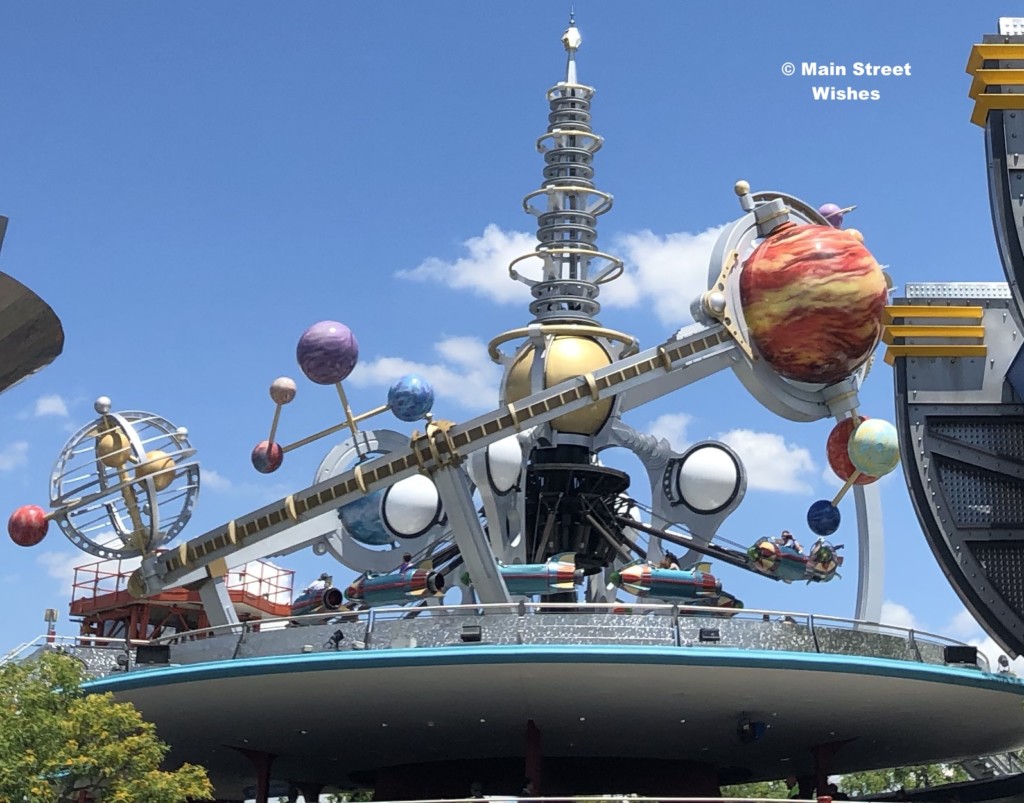 This high-flying ride is located in Tomorrowland, above the PeopleMover. Not only is this a fun little ride, but it also gives you some nice views of Tomorrowland. Guests board their 2-passenger spacecraft and spin around, surrounded by planets. As you are flying above Tomorrowland, the spacecraft picks up speed and you can control how high you go by pulling or pushing on the lever inside the ride vehicle. The ride is similar to how Dumbo and TriceraTop Spin work.